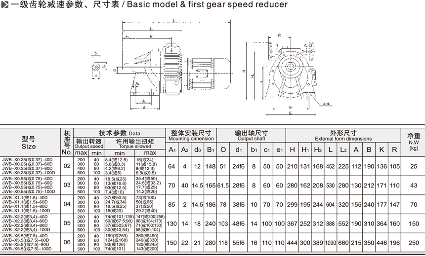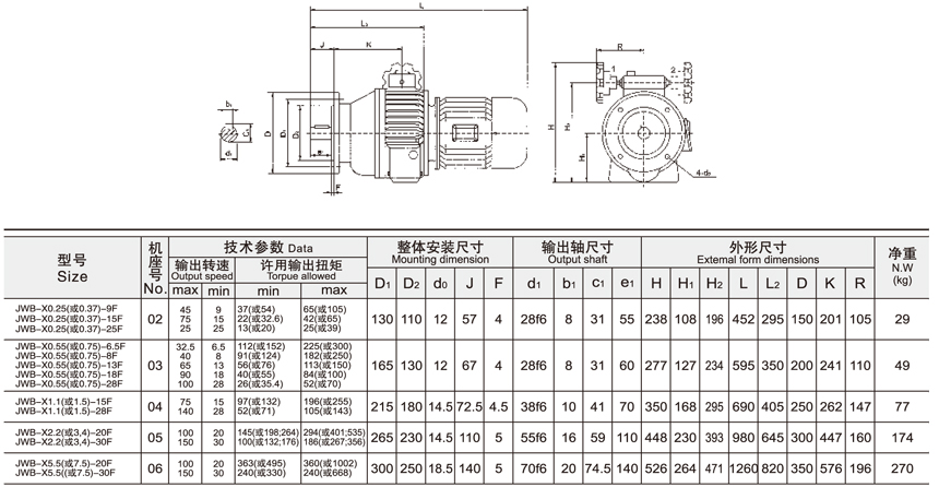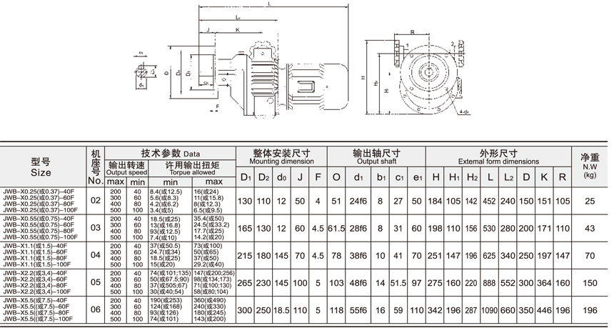JWB-X系列無級(jí)變速機(jī)一級(jí)二級(jí)參數(shù)與尺寸表